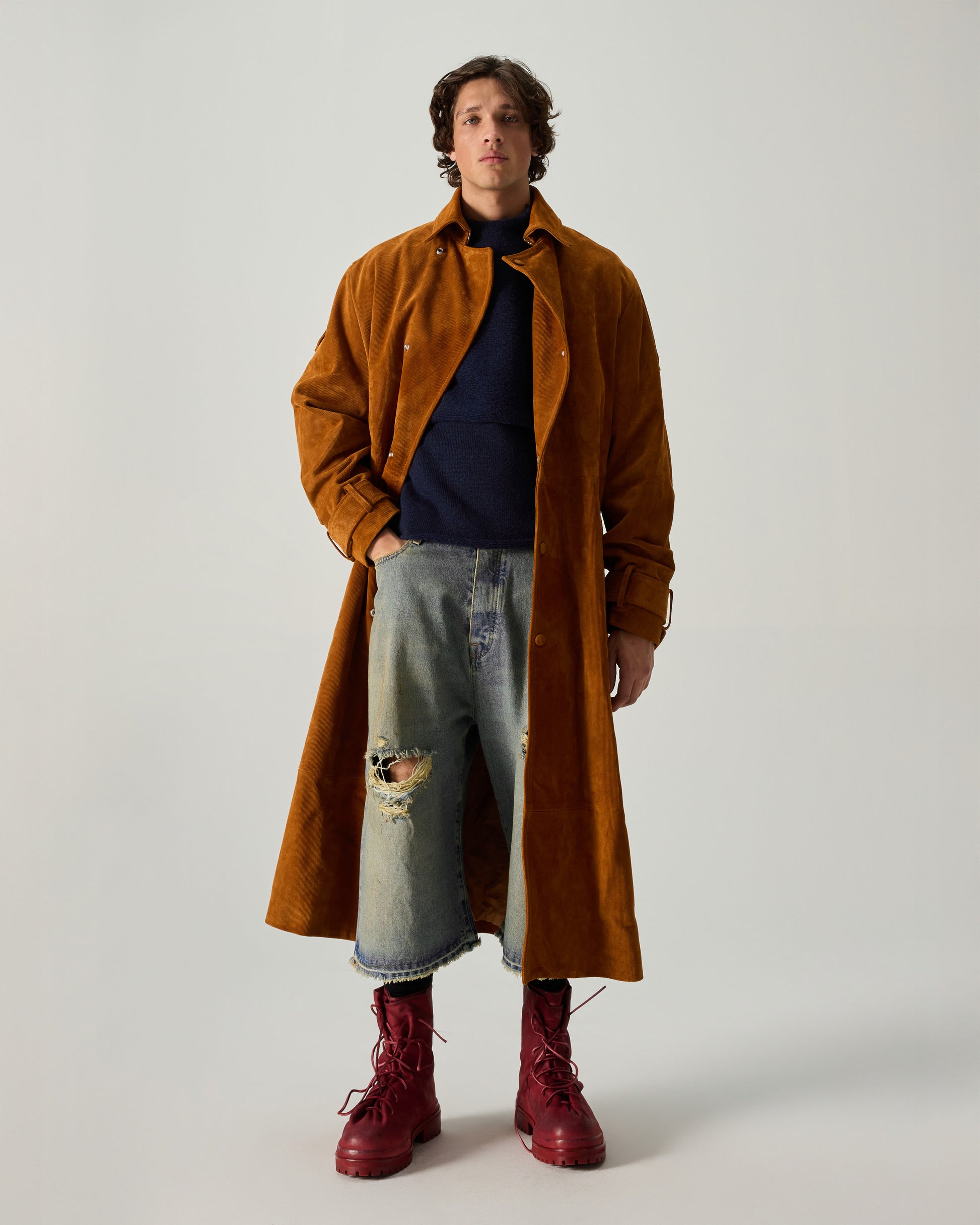 424 Corduroy Leather Belted Trench Coat in Caramel